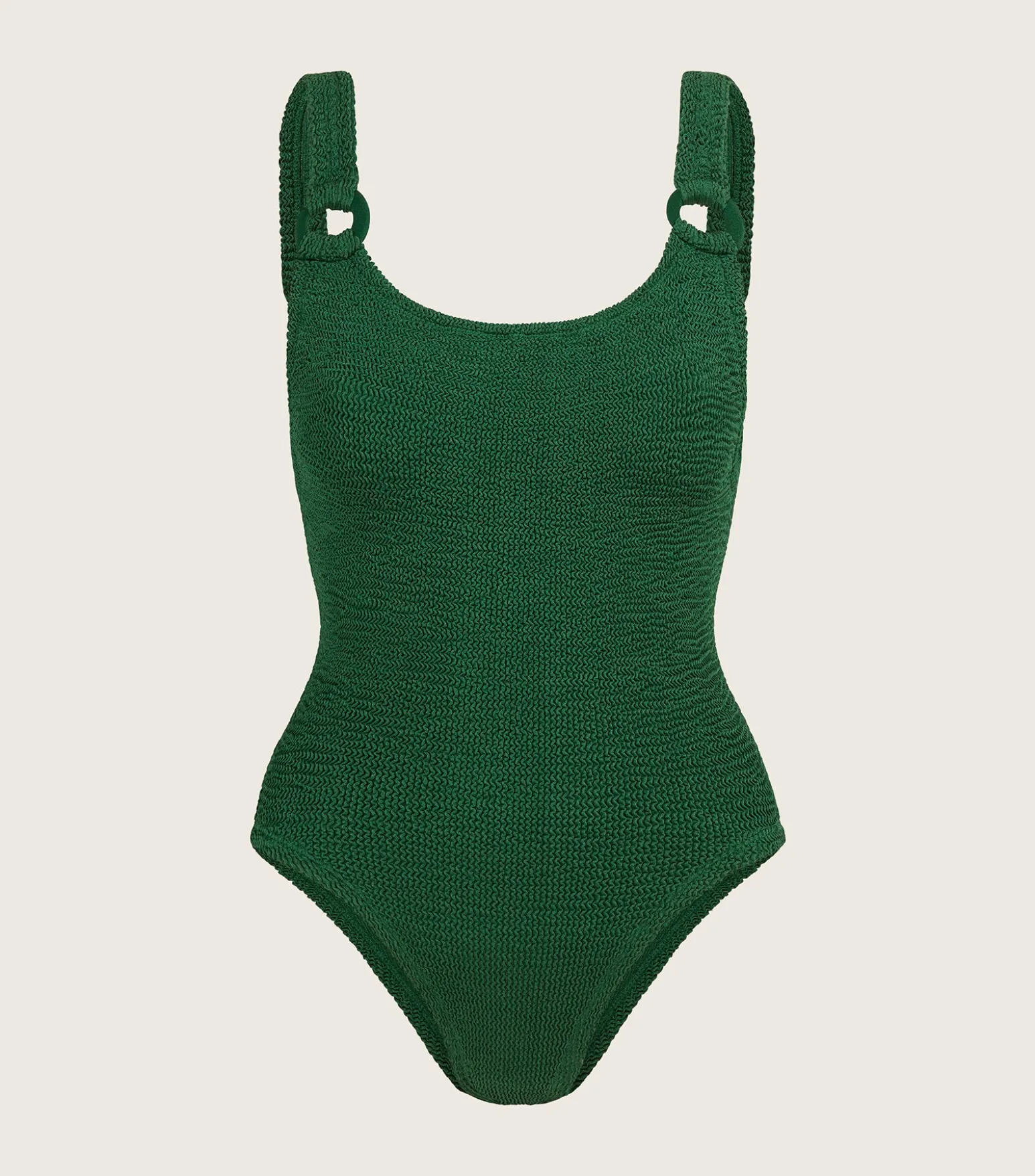The style that crashed our site. Our iconic dipped neck, scooped back Domino swimsuit, now reimagined with chic tonal hoop detailing. A modern take on an old friend.