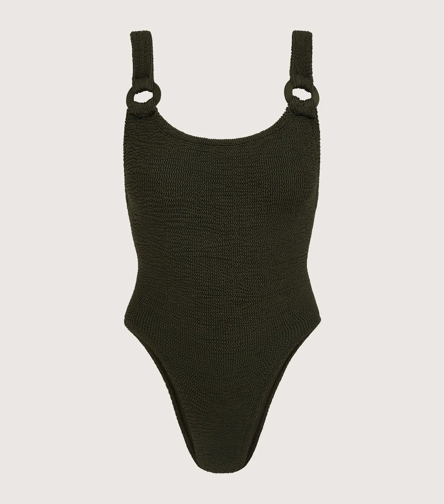 The style that crashed our site. Our iconic dipped neck, scooped back Domino swimsuit, now reimagined with chic tonal hoop detailing. A modern take on an old friend.