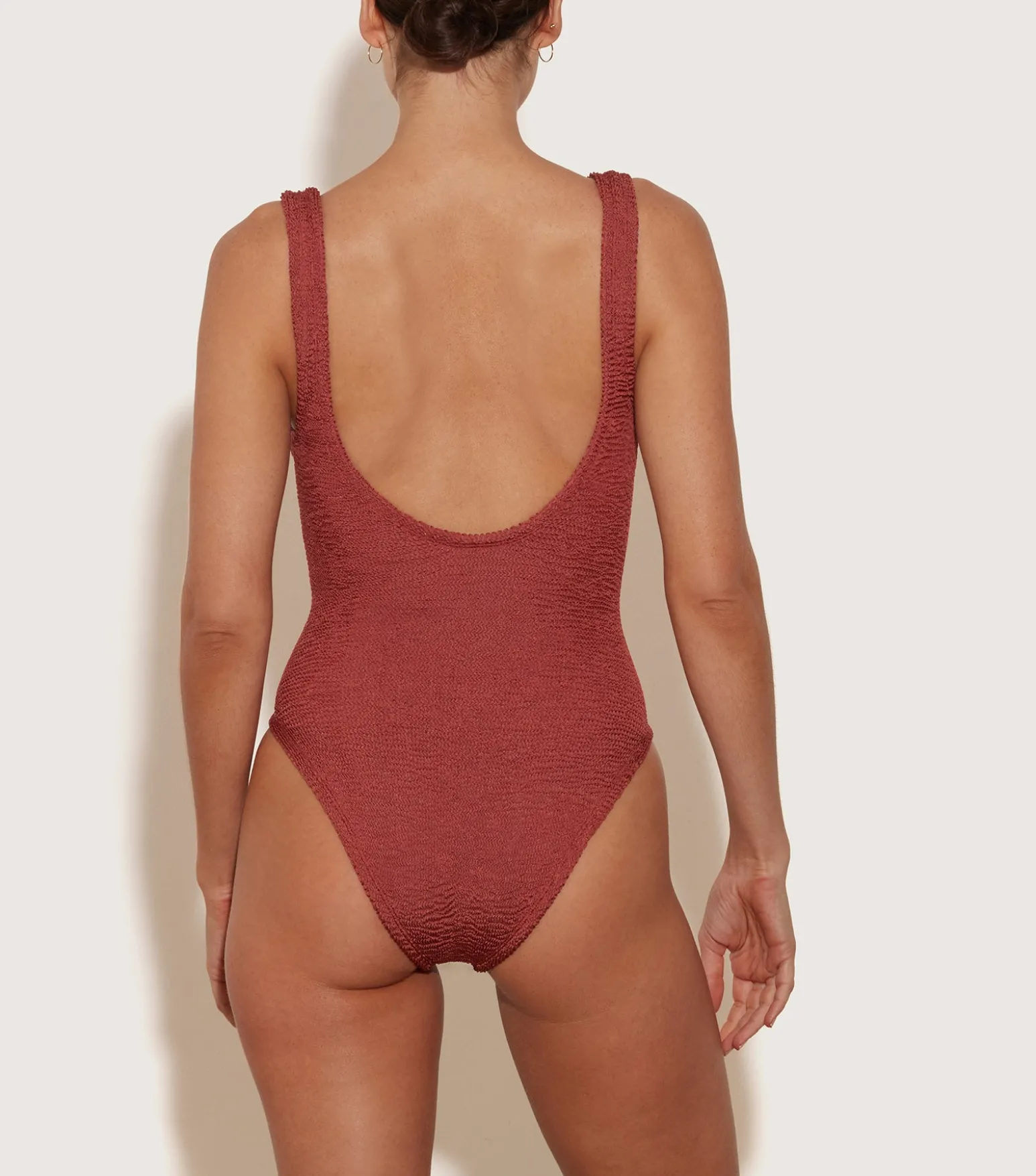 Modern swimsuit, timeless appeal. With tonal hoop detailing and a deep-v neckline, Celine has understated glamour down.